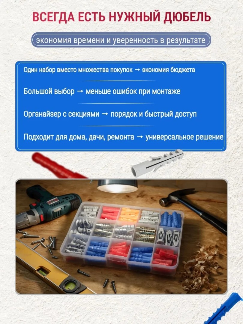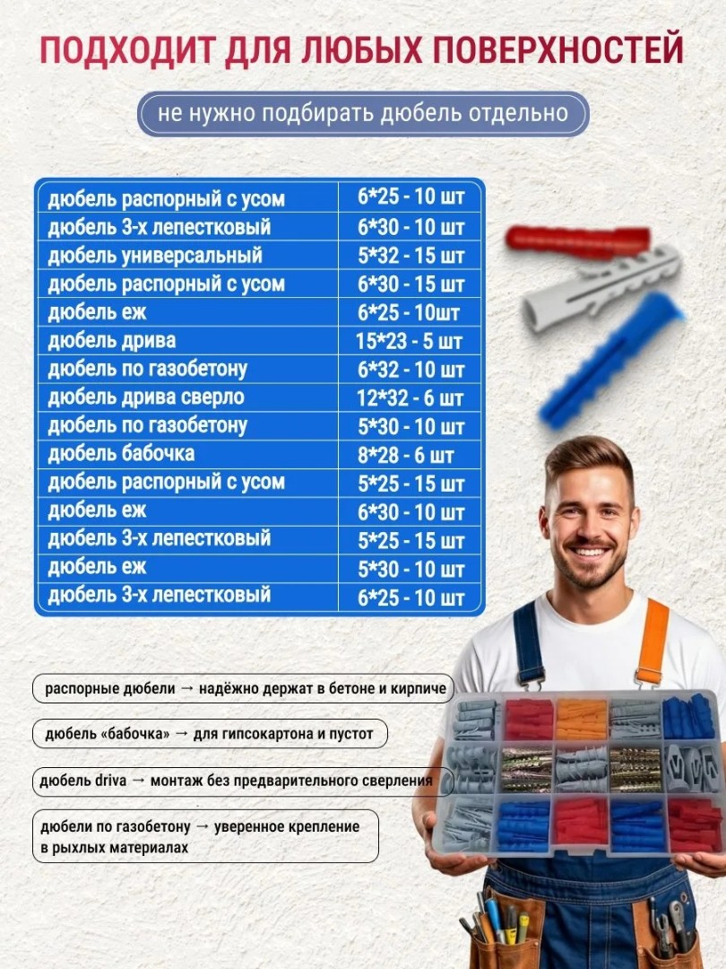 Наборы саморезов и дюбелей